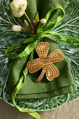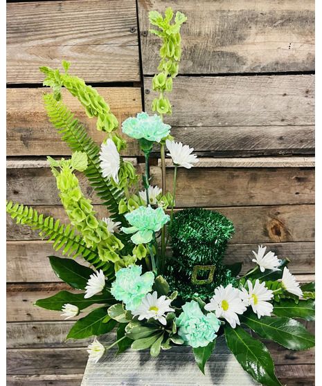 - A touch of fresh greenery or faux clover garland runs along the front edge